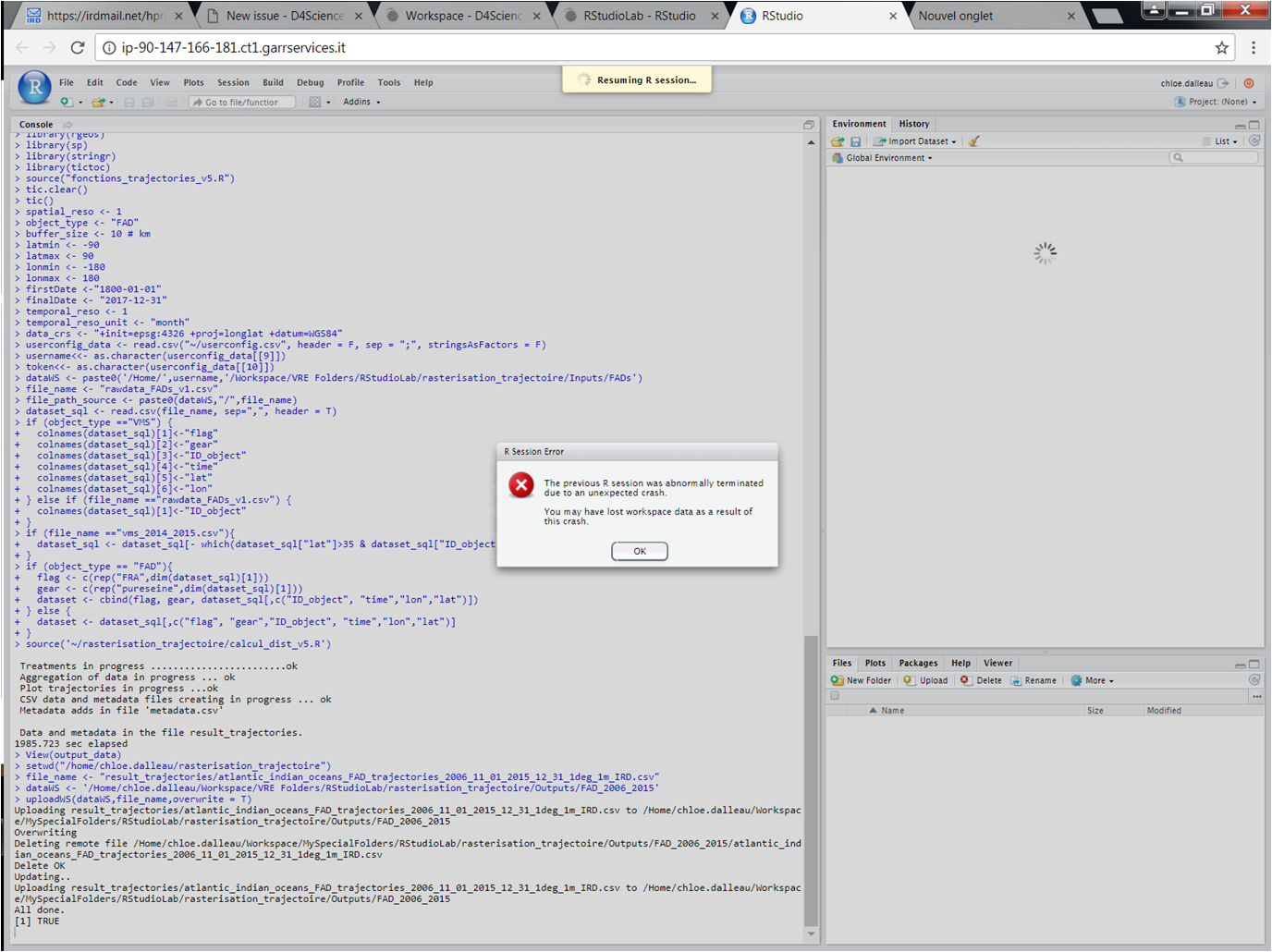 I lost all my working files and I can't use RStudio any more. I enclose two pictures with the following warning messages : "The previous R session was abnormally terminated due to an unexprected crash. You may have lost workspace data as a result of this crash." and "Error occured during transmission".